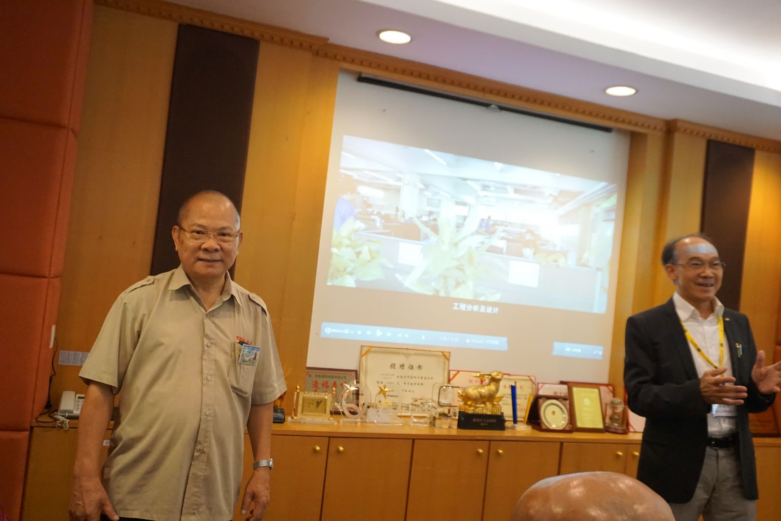 香港工業總會副主席/珠三角工業協會主席郭振華先生和興茂主席吳毓雄先生在會議室序幕介紹興茂電源有限公司歷史
