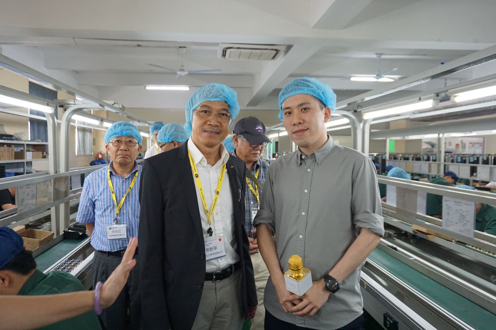 珠三角工業協會深圳分部副主席洪光椅先生, 香港工業總會副主席/珠三角工業協會主席郭振華先生和吳家萌先生參觀生產線合照